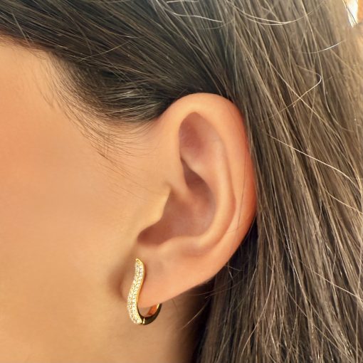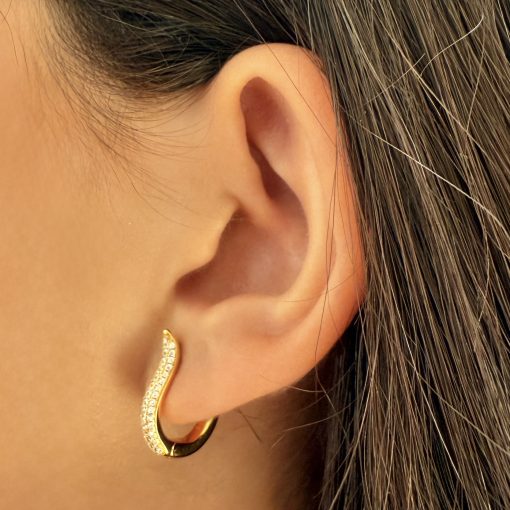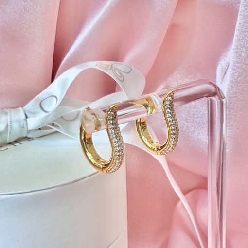 Minimalistisk med en twist. Øreringene har et smukt curvy design, der giver et lækkert og sofistikeret udtryk. De er lavet i ægte 925 sterling sølv, belagt med 18 karat guld og prydet med klar krystal, der fanger lyset fra alle vinkler.