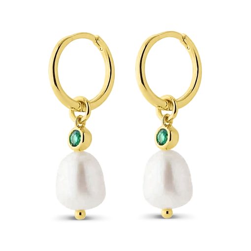 The Hoop earrings are made of Sterling Silver 925, plated with 18Karat Gold, and feature genuine freshwater pearls and a small emerald crystal.